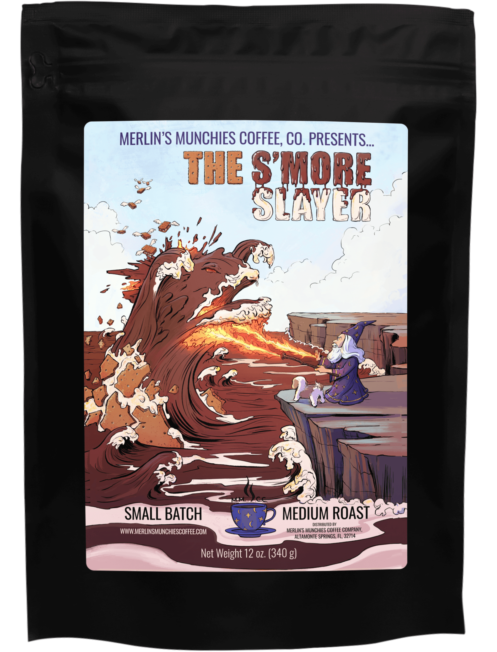 Merlin defeated the flavor-packed S'mores wave after an epic battle! He will now be forever known as the S'mores Slayer! Fortunately, they became friends and joined forces to make the best S'mores Coffee in the Multiverse! Enjoy our medium roast premium coffee beans infused with chocolate, toasted marshmallows, and traces of graham cracker. This coffee's smooth finish will leave you craving more!