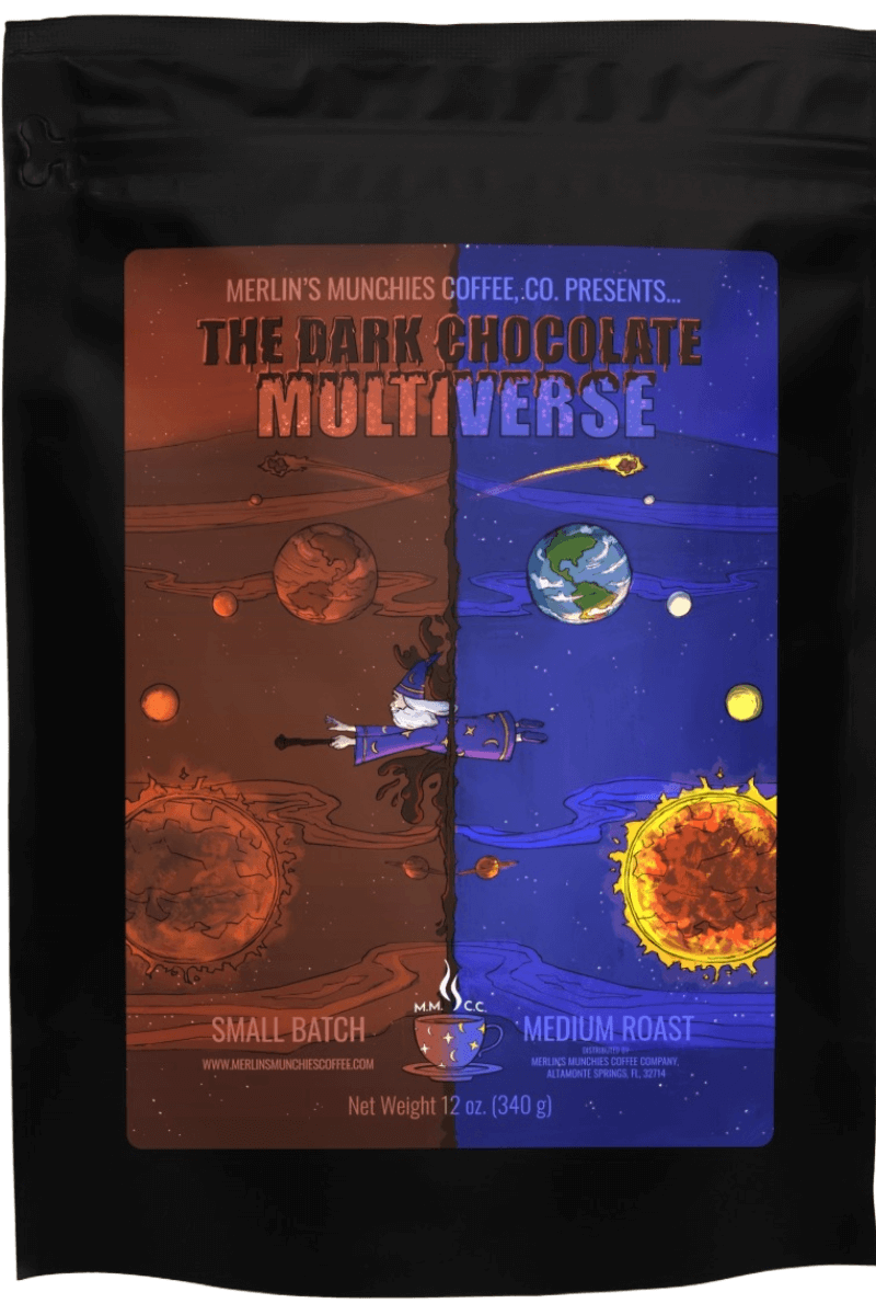 Delicious dark chocolate-flavored coffee! Merlin has officially left one universe and ventured into the next! It happens to be a parallel dark chocolate mirror universe. EVERYTHING is made of rich, smooth, dark chocolate. Merlin comes here to collect the best dark chocolate around. With a bit of roasting magic, prepare yourself for one of the most decadent, delightful cups of coffee you can imagine! If you love dark chocolate and perfection this is a must-try!!!
