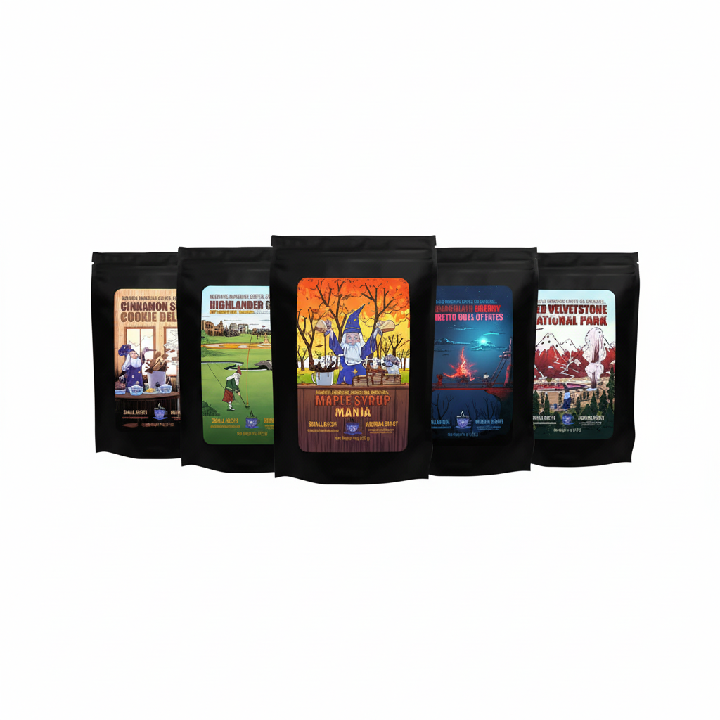 These are 5 of Merlin's all time favorites! We are sure it will bring a smile to your face. Each 4 oz bags makes around 10 cups of coffee for you to enjoy!
